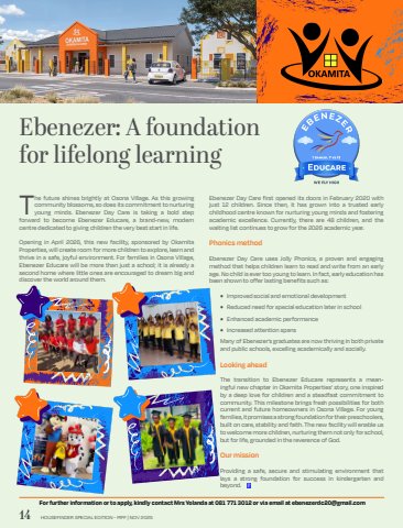 14HOUSEFINDER SPECIAL EDITION - PIPF | NOV 2025Ebenezer: A foundation for lifelong learningFor further information or to apply, kindly contact Mrs Yolanda at 081 771 3012 or via email at ebenezerdc20@gmail.comThe future shines brightly at Osona Village. As this growing community blossoms, so does its commitment to nurturing young minds. Ebenezer Day Care is taking a bold step forward to become Ebenezer Educare, a brand-new, modern centre dedicated to giving children the very best start in life.Opening in April 2026, this new facility, sponsored by Okamita Properties, will create room for more children to explore, learn and thrive in a safe, joyful environment. For families in Osona Village, Ebenezer Educare will be more than just a school; it is already a second home where little ones are encouraged to dream big and discover the world around them.Ebenezer Day Care first opened its doors in February 2020 with just 12 children. Since then, it has grown into a trusted early childhood centre known for nurturing young minds and fostering academic excellence. Currently, there are 48 children, and the waiting list continues to grow for the 2026 academic year. Phonics methodEbenezer Day Care uses Jolly Phonics, a proven and engaging method that helps children learn to read and write from an early age. No child is ever too young to learn. In fact, early education has been shown to offer lasting benefits such as:%u2022Improved social and emotional development%u2022Reduced need for special education later in school%u2022Enhanced academic performance%u2022Increased attention spansMany of Ebenezer%u2019s graduates are now thriving in both private and public schools, excelling academically and socially.Looking aheadThe transition to Ebenezer Educare represents a meaningful new chapter in Okamita Properties%u2019 story, one inspired by a deep love for children and a steadfast commitment to community. This milestone brings fresh possibilities for both current and future homeowners in Osona Village. For young families, it promises a strong foundation for their preschoolers, built on care, stability and faith. The new facility will enable us to welcome more children, nurturing them not only for school, but for life, grounded in the reverence of God.Our mission Providing a safe, secure and stimulating environment that lays a strong foundation for success in kindergarten and beyond. P
