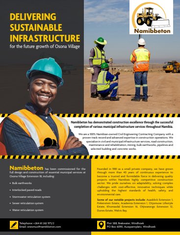 DELIVERING SUSTAINABLE INFRASTRUCTURE for the future growth of Osona VillageNamibbeton has demonstrated construction excellence through the successful completion of various municipal infrastructure services throughout Namibia.We are a 100% Namibian-owned Civil Engineering Contracting Company with a proven track record and advanced expertise in construction operations. We specialize in civil and municipal infrastructure services, road construction, maintenance and rehabilitation, mining, bulk earthworks, pipelines and selected building and concrete works. Namibbetonhas been commissioned for the full design and construction of essential municipal services at Osona Village Extension 18, including:%u2022Bulk earthworks%u2022Interlocked paved roads%u2022Stormwater reticulation system%u2022Sewer reticulation system%u2022Water reticulation systemFounded in 1981 as a small private company, we have grown through more than 40 years of continuous experience to become a trusted and formidable force in delivering quality projects within Namibia%u2019s highly competitive construction sector. We pride ourselves on adaptability, solving complex challenges with cost-effective, innovative techniques while upholding the highest standards of health, safety, and environmental care.Some of our notable projects include: Auasblick Extension 1, Finkenstein Estate, Academia Extension 1, Otjomuise Lifestyle Estate, Khomasdal Extension 16, Otjiwarongo Extension 12, Dunes Estate, Walvis Bay.Telephone: +264 61 262 971/2Email: onesmus@namibbeton.comPlot 388, Brakwater, WindhoekPO Box 6090, Ausspannplatz, Windhoek