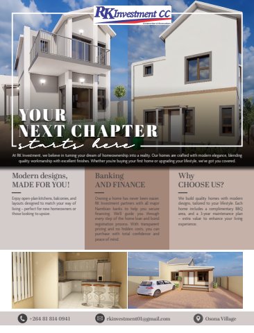 YO U R NEXT CHAPTERstarts hereModern designs,MADE FOR YOU!Enjoy open-plan kitchens, balconies, and layouts designed to match your way of living %u2013 perfect for new homeowners or those looking to upsize.BankingAND FINANCEOwning a home has never been easier. RK Investment partners with all major Namibian banks to help you secure financing. We%u2019ll guide you through every step of the home loan and bond registration process. With transparent pricing and no hidden costs, you can purchase with total confidence and peace of mind.WhyCHOOSE US?We build quality homes with modern designs, tailored to your lifestyle. Each home includes a complimentary BBQ area, and a 3-year maintenance plan %u2013 extra value to enhance your living experience.At RK Investment, we believe in turning your dream of homeownership into a reality. Our homes are crafted with modern elegance, blending quality workmanship with excellent finishes. Whether you%u2019re buying your first home or upgrading your lifestyle, we%u2019ve got you covered.+264 81 814 0941rkinvestment01@gmail.comOsona Village