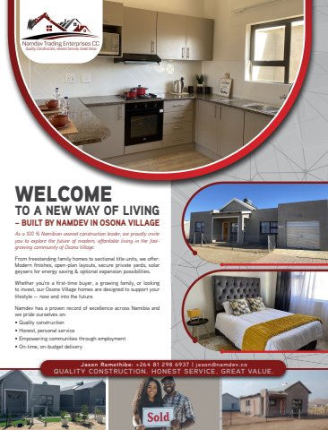 WELCOMETO A NEW WAY OF LIVING %u2013 BUILT BY NAMDEV IN OSONA VILLAGEAs a 100 % Namibian-owned construction leader, we proudly invite you to explore the future of modern, affordable living in the fastgrowing community of Osona Village. From freestanding family homes to sectional title units, we offer: Modern finishes, open-plan layouts, secure private yards, solar geysers for energy saving & optional expansion possibilities.Whether you're a first-time buyer, a growing family, or looking to invest, our Osona Village homes are designed to support your lifestyle %u2014 now and into the future.Namdev has a proven record of excellence across Namibia and we pride ourselves on:%u2022 Quality construction%u2022 Honest, personal service%u2022 Empowering communities through employment%u2022 On-time, on-budget deliveryQuality Construction, Honest Service, Great ValueJason Ramothibe: +264 81 298 6937 | jason@namdev.coQUALITY CONSTRUCTION. HONEST SERVICE. GREAT VALUE.