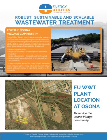 FOR THE OSONA VILLAGE COMMUNITYEnergy Utilities delivers smart, scalable wastewater treatment (WWT) solutions tailored for growing industries & communities. Our system at Osona Village treats 1,000 m%u00b3/day of wastewater, with the ability to expand modularly in 1,000 m%u00b3/day increments ensuring seamless growth alongside the development.%u2022Modular expansion ready%u2022Fully outsourced model %u2013 We own, operate, and maintain the system%u2022Simple outsourcing fee %u2013 No capital investment required%u2022Environmentally responsible %u2013 Built for long-term efficiency and sustainabilityOur modular system ensures that Osona Village%u2019s wastewater treatment capacity grows in step with its development without placing additional financial or operational burdens on the community.ROBUST, SUSTAINABLE AND SCALABLE WASTEWATER TREATMENTCorner of Feld & Thorer Street, Windhoek, Namibia | +264 (0) 83 345 1040info@energyutilities.com.na | www.energyutilities.com.naEU WWT PLANT LOCATION AT OSONATo service the Osona Village community