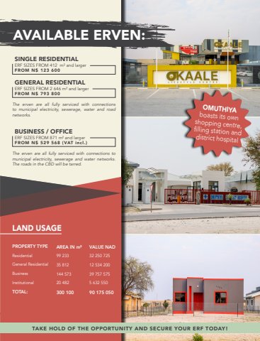 BRUSH STROKELorem ipsum dolor sit amet, consectetuer adipiscing elit, sed diam nonummy nibh euismod tincidunt ut laoreet AVAILABLE ERVEN:SINGLE RESIDENTIALERF SIZES FROM 412 m%u00b2 and largerFROM N$ 123 600GENERAL RESIDENTIALERF SIZES FROM 2 646 m%u00b2 and largerFROM N$ 793 800The erven are all fully serviced with connections to municipal electricity, sewerage, water and road networks.BUSINESS / OFFICE ERF SIZES FROM 871 m%u00b2 and largerFROM N$ 529 568 (VAT incl.) The erven are all fully serviced with connections to municipal electricity, sewerage and water networks. The roads in the CBD will be tarred.PROPERTY TYPEResidentialGeneral ResidentialBusinessInstitutionalTOTAL:AREA IN m%u00b299 23335 812144 57320 482300 100VALUE NAD32 250 72512 534 20039 757 5755 632 55090 175 050LAND USAGETAKE HOLD OF THE OPPORTUNITY AND SECURE YOUR ERF TODAY!OMUTHIYA boasts its own shopping centre, filling station and district hospital