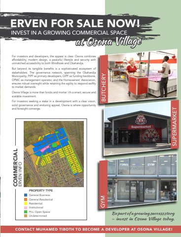 For investors and developers, the appeal is clear. Osona combines affordability, modern design, a peaceful lifestyle and security with unmatched accessibility to both Windhoek and Okahandja. But beyond its tangible benefits is a sophisticated ecosystem of stakeholders. The governance network, spanning the Okahandja Municipality, PIPF as primary developers, GIPF as funding backbone, OPMC as management operator, and the Homeowners%u2019 Association, ensures robust oversight while retaining the agility to respond swiftly to market demands.Osona Village is more than bricks and mortar: it%u2019s a smart, secure and scalable investment. For investors seeking a stake in a development with a clear vision, solid governance and enduring appeal, Osona is where opportunity and foresight converge.Be part of a growing success story %u2013 invest in Osona Village today.BRUSH STROKELorem ipsum dolor sit amet, consectetuer adipiscing elit, sed diam nonummy nibh euismod tincidunt ut laoreet ERVEN FOR SALE NOW!PROPERTY TYPEGeneral BusinessGeneral ResidentialResidentialInstitutionalPriv. Open SpaceUndeterminedCOMMERCIAL ERVEN INFOINVEST IN A GROWING COMMERCIAL SPACEat Osona Village CONTACT MUHAMED TIBOTH TO BECOME A DEVELOPER AT OSONA VILLAGE!BUTCHERYSUPERMARKETGYM