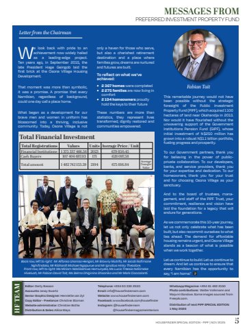 HOUSEFINDER SPECIAL EDITION - PIPF | NOV 20255MESSAGES FROMPREFERRED INVESTMENT PROPERTY FUNDLetter from the ChairmanFabian TaitEditor: Gerty BassonAccounts: Janay SwartzSenior Graphic Designer: Henriette van ZylCopy Editor - Freelance: Christine StomanWebsite administrator: Christian BothaDistribution & Sales: Al%u00e9za MaysTelephone: +264 83 336 2530Email: info@housefindernam.com Website: www.housefindernam.comFacebook: www.facebook.com/housefinderInstagram: @housefindernam @housefindermagazineinteriorsWhatsapp Magazine: +264 81 462 2150Photo contributions:Walter Volkmann andMajumi Gondwe. Some images sourced from Freepik.com.Distribution of next PIPF SPECIAL EDITION: 1 May 2026HF TEAMBack row, left to right: Mr Alfonso Unanisa Hengari, Mr Browny Mutrifa, Mr Jacob Nafimane Nghifindaka, Mr Ribhardt Michael Ngapurue and Mr Ignatius Hinky Theodore.Front row, left to right: Ms Miriam Ndalilashiwa Hamunyela, Ms Lucia Treesia Ndilimeke Hiveluah, Mr Fabian David Tait, Ms Selma Dhiginina Shaanika and Mr Mark Cioccolanti. We look back with pride to an achievement now widely hailed as a leading-edge project. Ten years ago, in September 2015, the late President Hage Geingob laid the first brick at the Osona Village Housing Development. That moment was more than symbolic, it was a promise. A promise that every Namibian, regardless of background, could one day call a place home.What began as a development for our brave men and women in uniform has blossomed into a thriving, inclusive community. Today, Osona Village is not only a haven for those who serve, but also a cherished retirement destination and a place where families grow, dreams are nurtured and futures are built.To reflect on what we%u2019ve achieved:%u20222 367 homes were completed%u20222 275 families are now living in comfort%u20222 194 homeowners proudly hold the keys to their futureThese numbers are more than statistics, they represent lives transformed, dignity restored and communities empowered.This remarkable journey would not have been possible without the strategic foresight of the Public Investment Property Fund (PIPF), which acquired 1 100 hectares of land near Okahandja in 2013. Nor would it have flourished without the unwavering support of the Government Institutions Pension Fund (GIPF), whose initial investment of N$250 million has grown into a robust N$1.1 billion portfolio, fueling progress and prosperity.To our Government partners, thank you for believing in the power of publicprivate collaboration. To our developers, banks, and service providers, thank you for your expertise and dedication. To our homeowners, thank you for your trust and for choosing Osona Village as your sanctuary.And to the board of trustees, management, and staff of the PIPF Trust, your commitment, resilience and vision have laid the foundation for a legacy that will endure for generations.As we commemorate this 10-year journey, let us not only celebrate what has been built, but also recommit ourselves to what lies ahead. The demand for affordable housing remains urgent, and Osona Village stands as a beacon of what is possible when we work together.Let us continue to build. Let us continue to dream. And let us continue to ensure that every Namibian has the opportunity to say, %u201cI am home.%u201d PTotal RegistrationsValuesUnitsAverage Price / UnitFinancial Institutions1 375 337 466.562023679 850.45Cash Buyers107 404 687.03 171628 097.58Total amount1 482 742 153.592194675 816.84Average Transfer ValueTotal Financial Investment