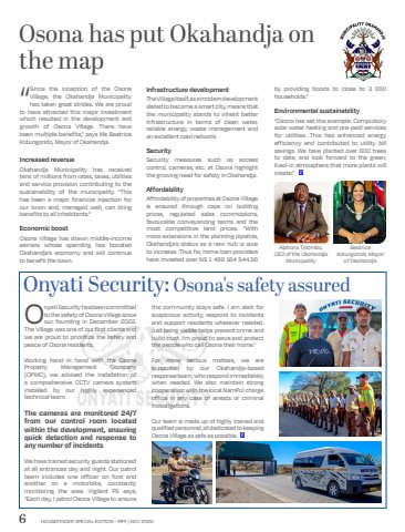 6HOUSEFINDER SPECIAL EDITION - PIPF | NOV 2025Onyati Security has been committed to the safety of Osona Village since our founding in December 2022. The Village was one of our first clients and we are proud to prioritize the safety and peace of Osona residents. Working hand in hand with the Osona Property Management Company (OPMC), we advised the installation of a comprehensive CCTV camera system installed by our highly experienced technical team. The cameras are monitored 24/7 from our control room located within the development, ensuring quick detection and response to any number of incidents. We have trained security guards stationed at all entrances day and night. Our patrol team includes one officer on foot and another on a motorbike, constantly monitoring the area. Vigilant PS says, %u201cEach day, I patrol Osona Village to ensure Onyati Security: Osona's safety assuredthe community stays safe. I am alert for suspicious activity, respond to incidents and support residents wherever needed. Just being visible helps prevent crime and build trust. I%u2019m proud to serve and protect the people who call Osona their home.%u201dFor more serious matters, we are supported by our Okahandja-based response team, who respond immediately when needed. We also maintain strong cooperation with the local NamPol charge office in any case of arrests or criminal investigations. Our team is made up of highly trained and qualified personnel, all dedicated to keeping Osona Village as safe as possible.POsona has put Okahandja on the map%u201cSince the inception of the Osona Village, the Okahandja Municipality has taken great strides. We are proud to have attracted this major investment which resulted in the development and growth of Osona Village. There have been multiple benefits,%u201d says Ms Beatrice Kotungondo, Mayor of Okahandja.Increased revenueOkahandja Municipality has received tens of millions from rates, taxes, utilities and service provision contributing to the sustainability of the municipality. %u201cThis has been a major financial injection for our town and, managed well, can bring benefits to all inhabitants.%u201dEconomic boostOsona Village has drawn middle-income earners whose spending has boosted Okahandja%u2019s economy and will continue to benefit the town.Infrastructure developmentThe Village itself, as a modern development slated to become a smart city, means that the municipality stands to inherit better infrastructure in terms of clean water, reliable energy, waste management and an excellent road network. SecuritySecurity measures such as access control, cameras, etc. at Osona highlight the growing need for safety in Okahandja.AffordabilityAffordability of properties at Osona Village is ensured through caps on building prices, regulated sales commissions, favourable conveyancing terms and the most competitive land prices. %u201cWith more extensions in the planning pipeline, Okahandja%u2019s status as a new hub is sure to increase. Thus far, home loan providers have invested over N$ 1 469 164 544.56 by providing bonds to close to 3 000 households.%u201d Environmental sustainability%u201cOsona has set the example: Compulsory solar water heating and pre-paid services for utilities. This has enhanced energy efficiency and contributed to utility bill savings. We have planted over 600 trees to date, and look forward to the green, lived-in atmosphere that more plants will create.%u201d PBeatrice Kotungondo, Mayor of OkahandjaAlphons Tjitombo,CEO of the Okahandja Municipality ONYATI SECURITY