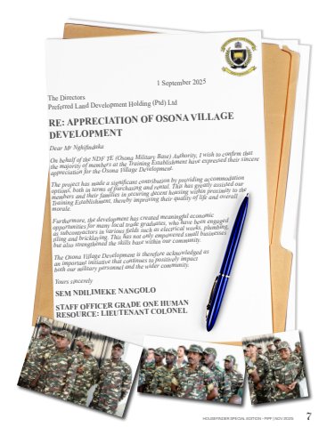 HOUSEFINDER SPECIAL EDITION - PIPF | NOV 20257 1 September 2025The DirectorsPreferred Land Development Holding (Ptd) Ltd RE: APPRECIATION OF OSONA VILLAGE DEVELOPMENTDear Mr NghifindakaOn behalf of the NDF TE (Osona Military Base) Authority, I wish to confirm that the majority of members at the Training Establishment have expressed their sincere appreciation for the Osona Village Development.The project has made a significant contribution by providing accommodation options, both in terms of purchasing and rental. This has greatly assisted our members and their families in securing decent housing within proximity to the Training Establishment, thereby improving their quality of life and overall morale.Furthermore, the development has created meaningful economic opportunities for many local trade graduates, who have been engaged as subcontractors in various fields such as electrical works, plumbing, tiling and bricklaying. This has not only empowered small businesses but also strengthened the skills base within our community.The Osona Village Development is therefore acknowledged as an important initiative that continues to positively impact both our military personnel and the wider community.Yours sincerelySEM NDILIMEKE NANGOLOSTAFF OFFICER GRADE ONE HUMAN RESOURCE: LIEUTENANT COLONEL