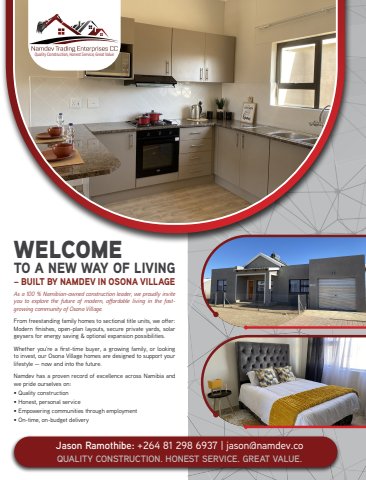 WELCOMETO A NEW WAY OF LIVING %u2013 BUILT BY NAMDEV IN OSONA VILLAGEAs a 100 % Namibian-owned construction leader, we proudly invite you to explore the future of modern, affordable living in the fastgrowing community of Osona Village. From freestanding family homes to sectional title units, we offer: Modern finishes, open-plan layouts, secure private yards, solar geysers for energy saving & optional expansion possibilities.Whether you're a first-time buyer, a growing family, or looking to invest, our Osona Village homes are designed to support your lifestyle %u2014 now and into the future.Namdev has a proven record of excellence across Namibia and we pride ourselves on:%u2022 Quality construction%u2022 Honest, personal service%u2022 Empowering communities through employment%u2022 On-time, on-budget deliveryQuality Construction, Honest Service, Great ValueJason Ramothibe: +264 81 298 6937 | jason@namdev.coQUALITY CONSTRUCTION. HONEST SERVICE. GREAT VALUE.