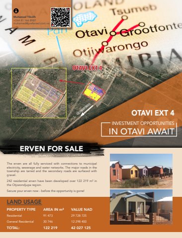 INVESTMENT OPPORTUNITIESIN OTAVI AWAITOTJIWARONGOOTAVI EXT 4OTAVI EXT 4The erven are all fully serviced with connections to municipal electricity, sewerage and water networks. The major roads in the township are tarred and the secondary roads are surfaced with gravel.242 residential erven have been developed over 122 219 m%u00b2 in the Otjozondjupa region.Secure your erven now - before the opportunity is gone!ERVEN FOR SALEMuhamed Tiboth +264 81 166 8987muhamed@preferred.com.naPROPERTY TYPEResidentialGeneral ResidentialTOTAL:AREA IN m%u00b291 47330 746122 219VALUE NAD29 728 72512 298 40042 027 125LAND USAGE