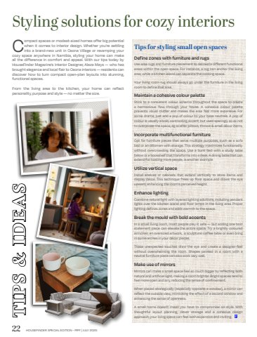 22HOUSEFINDER SPECIAL EDITION - PIPF | JULY 2025Styling solutions for cozy interiorsCompact spaces or modest-sized homes offer big potential when it comes to interior design. Whether you%u2019re settling into a brand-new unit in Osona Village or revamping your cozy space anywhere in Namibia, styling your home can make all the difference in comfort and appeal. With our tips today by HouseFinder Magazine%u2019s Interior Designer, Aleza Mays %u2014 who has brought elegance and local flair to Osona interiors %u2014 residents can discover how to turn compact open-plan layouts into stunning, functional spaces. From the living area to the kitchen, your home can reflect personality, purpose and style %u2014 no matter the size.Tips for styling small open spacesDefine zones with furniture and rugsUse area rugs and furniture placement to delineate different functional areas within the open space. For instance, a rug can anchor the living area, while a kitchen island can separate the cooking space. Your living room rug should always go under the furniture in the living room to define that area.Maintain a cohesive colour paletteStick to a consistent colour scheme throughout the space to create a harmonious flow through your house. A cohesive colour palette prevents visual clutter and makes the area feel more expansive. For some drama, just add a pop of colour to your base neutrals. A pop of colour is usually a bold, contrasting accent, but used sparingly so as not to overpower the space, eg scatter pillows, throws & small d%u00e9cor items.Incorporate multifunctional furnitureOpt for furniture pieces that serve multiple purposes, such as a sofa bed or an ottoman with storage. This strategy maximizes functionality without overcrowding the space. Use a bunk bed with a study table below or a bookshelf that transforms into a desk. A dining table that can extend for hosting more people, is another exampleUtilize vertical spaceInstall shelves or cabinets that extend vertically to store items and display d%u00e9cor. This technique frees up floor space and draws the eye upward, enhancing the room%u2019s perceived height. Enhance lightingCombine natural light with layered lighting solutions, including pendant lights over the kitchen island and floor lamps in the living area. Proper lighting defines zones and adds warmth to the space.Break the mould with bold accentsIn a small living room, most people play it safe %u2014 but adding one bold statement piece can elevate the entire space. Try a brightly coloured armchair, an oversized artwork, a sculptural coffee table or even bring in some arches in your d%u00e9cor pieces. These unexpected touches draw the eye and create a designer-feel without overwhelming the room. Shapes painted in a room with a neutral furniture piece can also work very well. Make use of mirrorsMirrors can make a small space feel so much bigger by reflecting both natural and artificial light, making a room brighter. Bright spaces tend to feel more open and airy, reducing the sense of confinement.When placed strategically (especially opposite a window), a mirror can reflect the outside view, mimicking the effect of a second window and enhancing the sense of openness.A small home doesn%u2019t mean you have to compromise on style. With thoughtful layout planning, clever storage and a cohesive design TIPS & IDEASapproach, your living space can feel both expansive and inviting. P