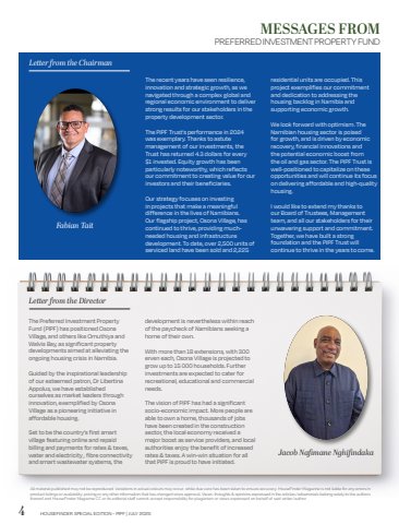 4HOUSEFINDER SPECIAL EDITION - PIPF | JULY 2025MESSAGES FROMPREFERRED INVESTMENT PROPERTY FUNDAll material published may not be reproduced. Variations in actual colours may occur, while due care has been taken to ensure accuracy. HouseFinder Magazine is not liable for any errors in product listings or availability, pricing or any other information that has changed since approval. Views, thoughts & opinions expressed in the articles/advertorials belong solely to the authors thereof and HouseFinder Magazine CC or its editorial staff cannot accept responsibility for plagiarism or views expressed on behalf of said writer/author. Jacob Nafimane Nghifindaka Letter from the ChairmanThe recent years have seen resilience, innovation and strategic growth, as we navigated through a complex global and regional economic environment to deliver strong results for our stakeholders in the property development sector.The PIPF Trust%u2019s performance in 2024 was exemplary. Thanks to astute management of our investments, the Trust has returned 4.3 dollars for every $1 invested. Equity growth has been particularly noteworthy, which reflects our commitment to creating value for our investors and their beneficiaries.Our strategy focuses on investing in projects that make a meaningful difference in the lives of Namibians. Our flagship project, Osona Village, has continued to thrive, providing muchneeded housing and infrastructure development. To date, over 2,500 units of serviced land have been sold and 2,225 residential units are occupied. This project exemplifies our commitment and dedication to addressing the housing backlog in Namibia and supporting economic growth.We look forward with optimism. The Namibian housing sector is poised for growth, and is driven by economic recovery, financial innovations and the potential economic boost from the oil and gas sector. The PIPF Trust is well-positioned to capitalize on these opportunities and will continue its focus on delivering affordable and high-quality housing.I would like to extend my thanks to our Board of Trustees, Management team, and all our stakeholders for their unwavering support and commitment. Together, we have built a strong foundation and the PIPF Trust will continue to thrive in the years to come.Letter from the DirectorFabian TaitThe Preferred Investment Property Fund (PIPF) has positioned Osona Village, and others like Omuthiya and Walvis Bay, as significant property developments aimed at alleviating the ongoing housing crisis in Namibia. Guided by the inspirational leadership of our esteemed patron, DrLibertina Appolus, we have established ourselves as market leaders through innovation, exemplified by Osona Village as a pioneering initiative in affordable%u00a0housing.Set to be the country%u2019s first smart village featuring online and repaid billing and payments for rates & taxes, water and electricity , fibre connectivity and smart wastewater systems, the development is nevertheless within reach of the paycheck of Namibians seeking a home of their own.With more than 18 extensions, with 300 erven each, Osona Village is projected to grow up to 15 000 households. Further investments are expected to cater for recreational, educational and commercial needs. The vision of PIPF has had a significant socio-economic impact. More people are able to own a home, thousands of jobs have been created in the construction sector, the local economy received a major boost as service providers, and local authorities enjoy the benefit of increased rates & taxes. A win-win situation for all that PIPF is proud to have initiated.