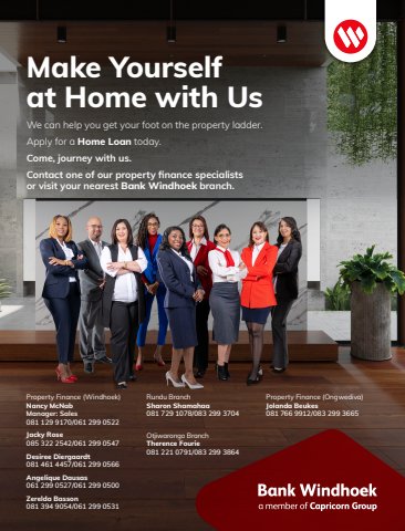 Make Yourself at Home with UsOtjiwarongo BranchTherence Fourie081 221 0791/083 299 3864Rundu BranchSharon Shamahaa081 729 1078/083 299 3704Property Finance (Ongwediva)Jolanda Beukes081 766 9912/083 299 3665Property Finance (Windhoek)Nancy McNabManager: Sales081 129 9170/061 299 0522Jacky Rose085 322 2542/061 299 0547Desiree Diergaardt081 461 4457/061 299 0566Angelique Dausas061 299 0527/061 299 0500Zerelda Basson081 394 9054/061 299 0531We can help you get your foot on the property ladder.Apply for a Home Loan today.Come, journey with us.Contact one of our property finance specialists or visit your nearest Bank Windhoek branch.