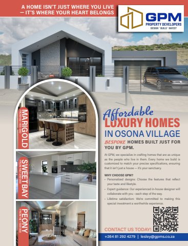 LUXURY HOMESIN OSONA VILLAGEAt GPM, we specialize in crafting homes that are as unique as the people who live in them. Every home we build is customized to match your precise specifications, ensuring that it isn%u2019t just a house %u2014 it%u2019s your sanctuary.WHY CHOOSE GPM?%u2022Personalized designs: Choose the features that reflect your taste and lifestyle.%u2022Expert guidance: Our experienced in-house designer will collaborate with you - each step of the way.%u2022Lifetime satisfaction: We%u2019re committed to making this special investment a worthwhile experience.A HOME ISN%u2019T JUST WHERE YOU LIVE %u2014 IT%u2019S WHERE YOUR HEART BELONGSAffordableCOMING SOON!CONTACT US TODAY!+264 81 292 4279 | lesley@gpms.co.zaBESPOKEHOMES BUILT JUST FOR YOU BY GPM.MARIGOLDSWEETBAYPEONYFROM N$ 1 400 000FROM N$ 1 200 000FROM N$ 1 500 000